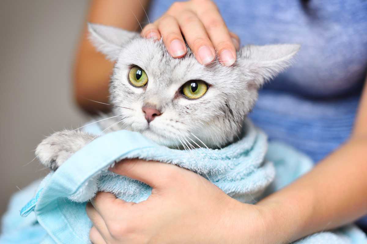 Once the bath is complete, wrap your cat in a towel to absorb the excess water. Gently rub them down to dry their fur.